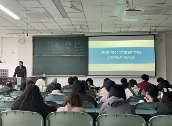 本网讯(文/陈志龙 图/侯琼瑶)为帮助2023级学生明确学习目标、找准发展方向,11月13日,法学与公共管理学院2023级年级大会在行知楼425教室顺利召开,由助管员、代理辅导员陈志龙主持。大会聚焦日常年级事务、学业规划指导与就业能力提升三大核心,为学生下一阶段的成长提供清晰指引。
