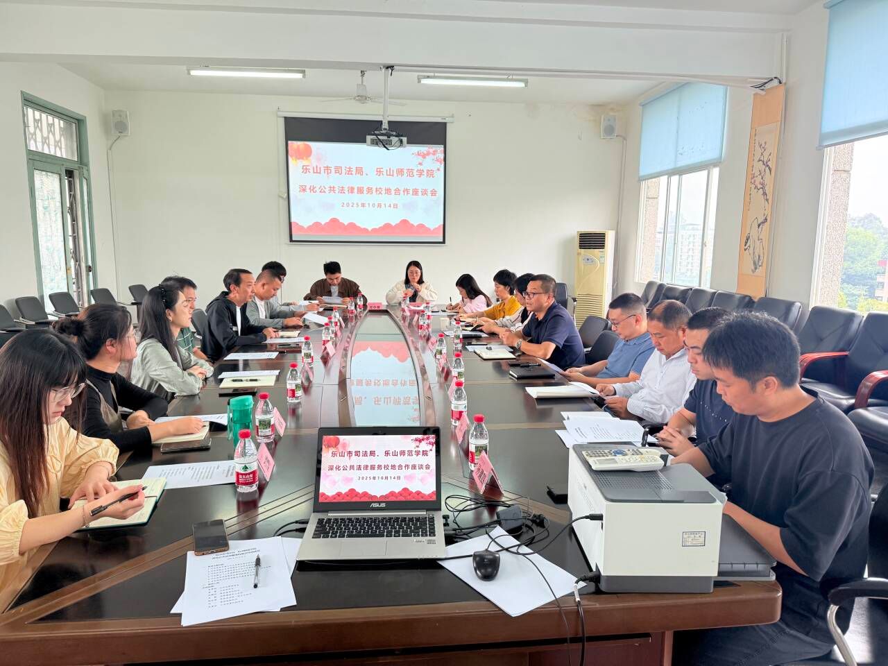 本网讯(文图/赵清,审核/董璐)10月14日上午,乐山市司法局、乐山师范学院法学与公共管理学院深化公共法律服务校地合作座谈会在我校博雅楼5楼会议室召开。乐山市司法局、市中区司法局以及沐川县司法局主要科室的负责人和相关工作人员,法学与公共管理学院领导班子成员、教师代表参加了此次座谈会。