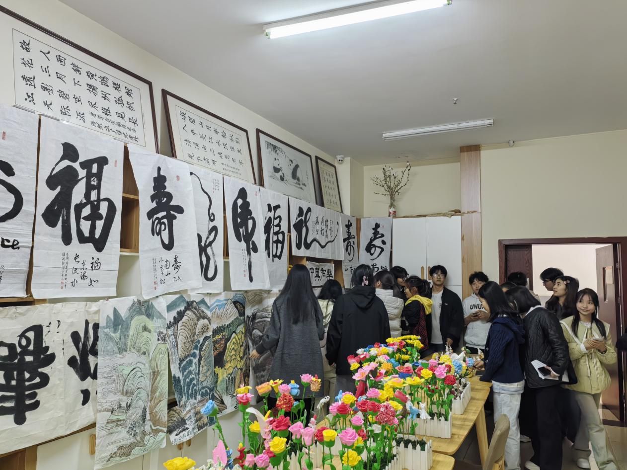 步入福利院内部,挂满墙面的书画作品瞬间抓住了大家的视线。大幅的“福”“寿”书法字笔力浑厚,旁边的山水国画晕染着雅致——工作人员介绍,这些作品均出自院内老人之手,是福利院“文化养老”项目的成果。同学们驻足欣赏,有同学拿出手机拍下一幅牡丹图:“原来‘积极老龄化’不是概念,是老人能用爱好把生活过得这么生动。”展区旁的花束与绿植点缀其间,让整个空间既显文化气息,又不失生活暖意。