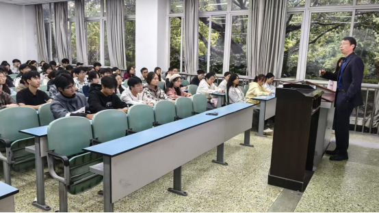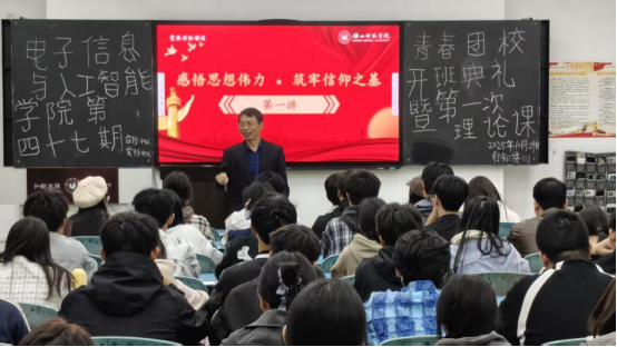 (本网讯 文/江琳 图/李瑶)为深化入党积极分子对党的创新理论的理解,筑牢理想信念根基,法学与公共管理学院第52期全体入党积极分子理论课学习于10月24日在行知楼111教室如期举行。电子信息与人工智能学院党委书记蒋强为课程主讲,学员悉数到场参与。