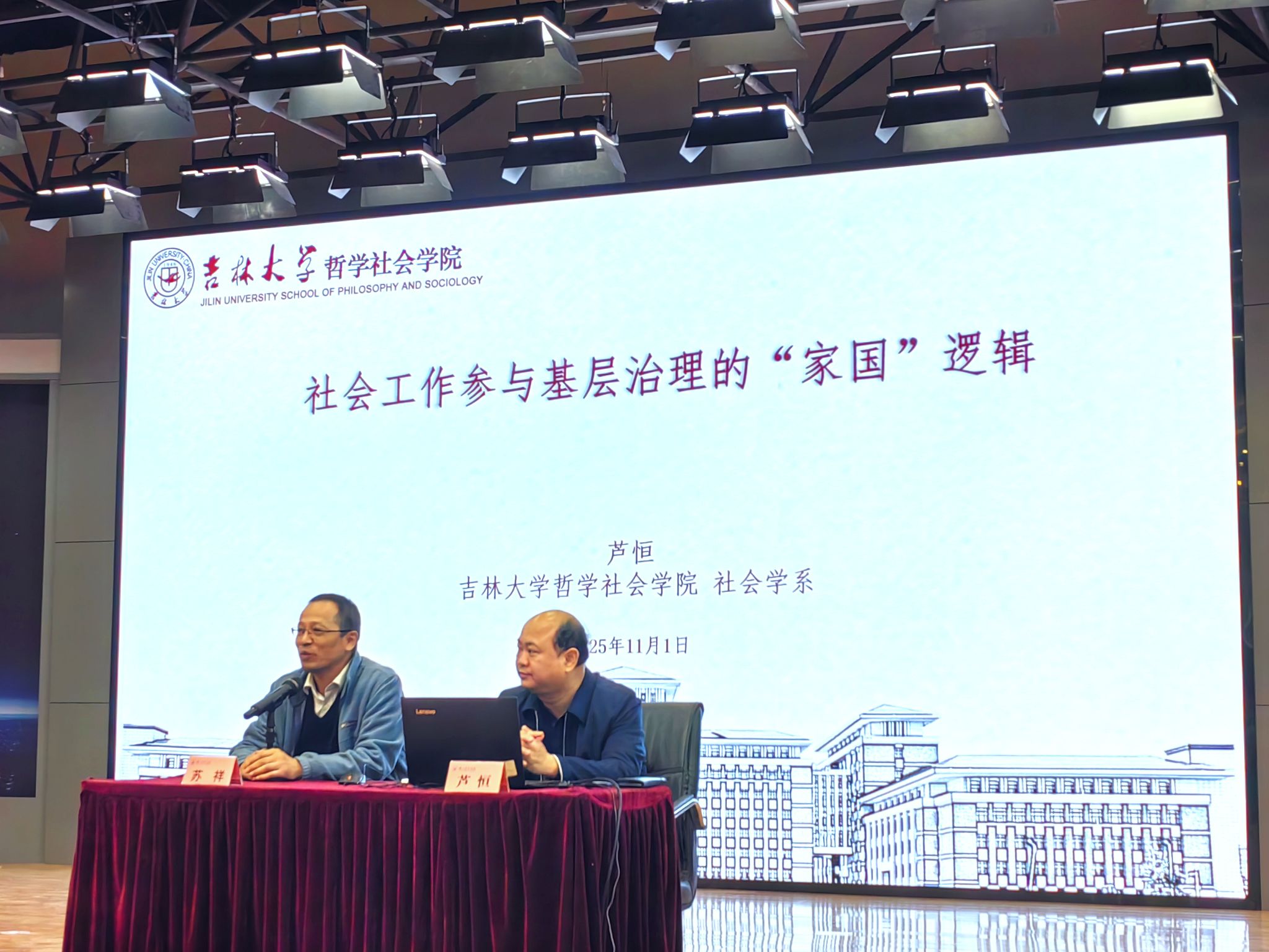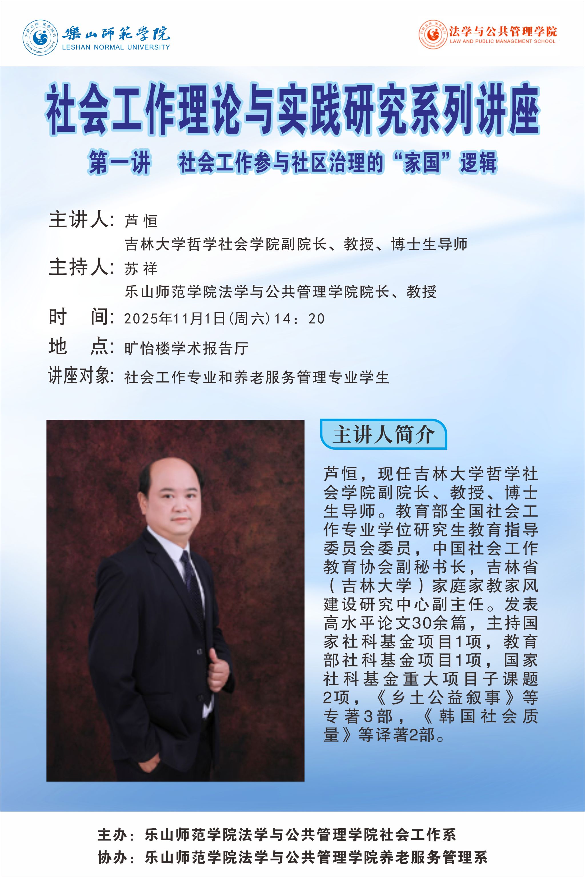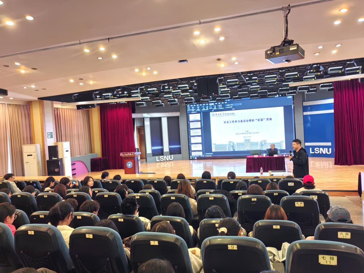 本网讯(文/潘楠、丁木乃 图/邱莎、赵佳钰 审核/董璐)2025年11月1日,在旷怡楼学术报告厅,法学与公共管理学院举办了社会工作理论与实践研究系列讲座第一讲。吉林大学哲学社会学院副院长、博士生导师芦恒教授应邀作题为《社会工作参与社区治理的“家国”逻辑》的专题报告。讲座由乐山师范学院法学与公共管理学院院长苏祥主持,我院社会工作和养老服务管理专业师生近200人参加。