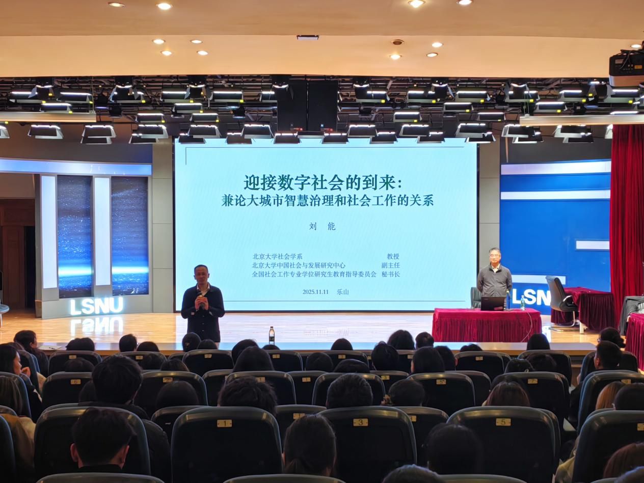 11月10日晚,北京大学社会学系刘能教授应邀在乐山师范学院旷怡楼学术报告厅,为“社会工作理论与实践研究系列讲座”带来第三讲《迎接数字社会的到来:兼论大城市智慧治理和社会工作的关系》。讲座由法学与公共管理学院院长苏祥教授主持,面向社会工作与养老服务管理专业学生。